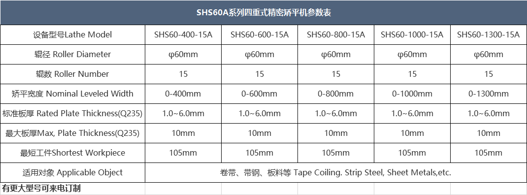四/六重式精密整平機是通過整平機多組滾筒滾壓式矯平,從而達到平整效果。四/六重式高精密整平機采用上、下排矯平工作輥與支撐軸承(輪)之間加裝支撐輥,構(gòu)成上下各二/三重共四/六重的組輥結(jié)構(gòu);矯平輥受力分布均勻,結(jié)構(gòu)剛性好,工作輥撓曲變形小,矯平精度高,行程諧波衰減性矯直,從根本上解決普通矯平常見的矯不平、易產(chǎn)生輥印壓痕、工件塌角、鐮刀彎等問題,提高板材的矯正精度,適用范圍廣,材料表面不會留下輥壓痕跡,矯正精度高。